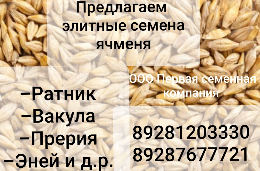 ООО "Первая семенная компания" предлагает высококачественные семена сельскохозяйственной продукции с полным пакетом документов и сертификатами :семена ячменя Ярового элитных и репродукционных сортов: